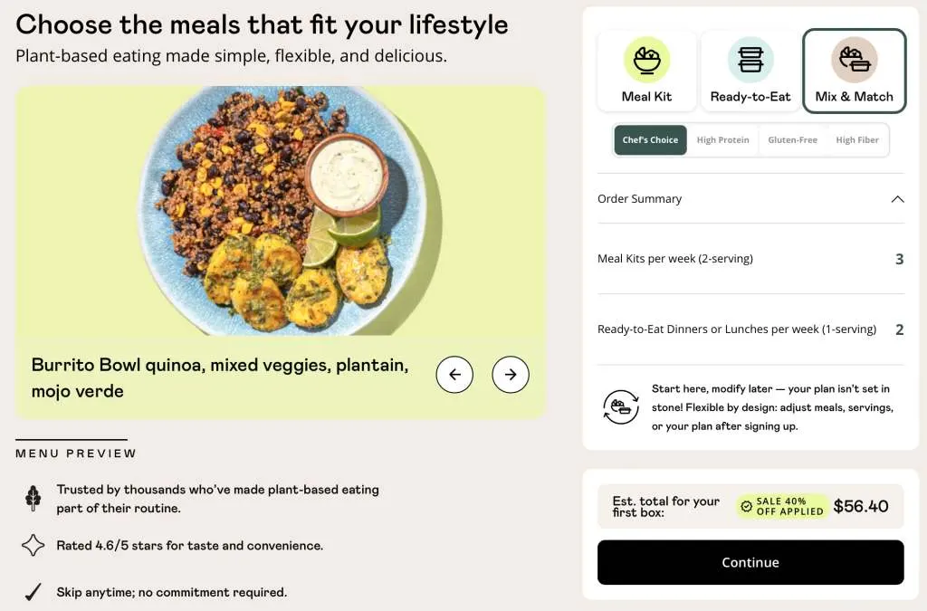 Purple Carrot starts out very similary to Hungryroot, asking you to pay for your first box without knowing what exactly you’ll get for that price. I chose their “Mix & Match” option, so I at least knew I’d be getting 3 meal kits and 2 ready-made meals.