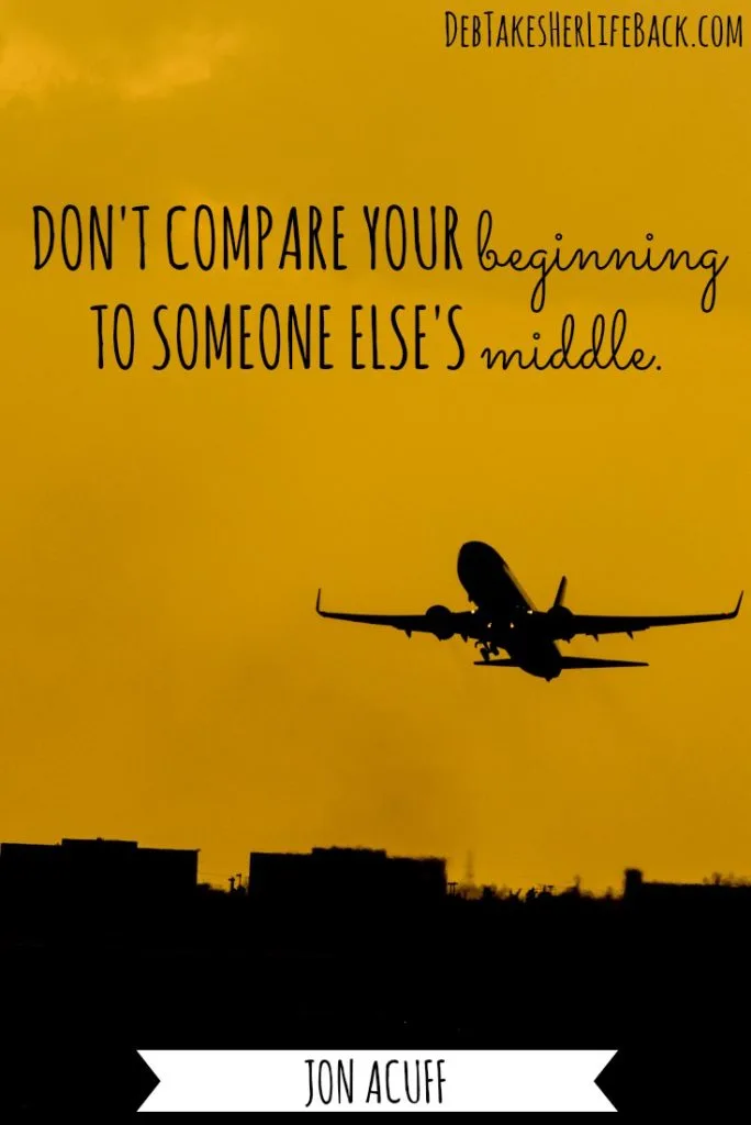 - Third, you can’t compare your beginning to someone else’s middle. Jon Acuff once said, “Don’t compare your beginning to someone else’s middle.” I may look at a blog and marvel at their followers and success, but that blog has been up and running for several years, and my own blog for only a few months. I may see someone with washboard abs and feel silly about my 30-minute video workout. But that person has been hard at work for years to define and sculpt their body. Your middle may look similar to where they are now, or even better! You just can’t compare yourself while you’re in two different stages.